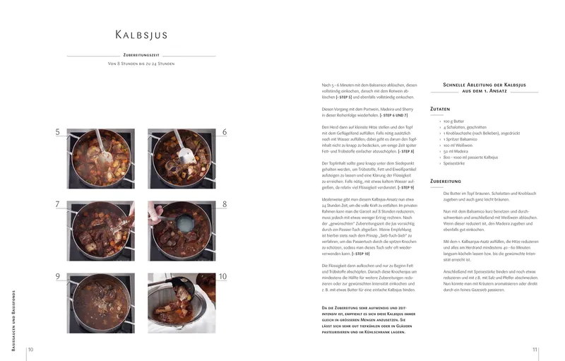 Alles fängt mit dem nötigen Equipment an, denn ohne das richtige Handwerkszeug geht nichts. Das fängt beim Herd an und hört beim Gazesieb auf. Man erhält wichtige Tipps über das Rösten von Knochen und über die Notwendigkeit der Saucenreifung, und erfährt, wie man Saucen richtig bindet, passiert und reduziert. Saucen mit Alkohol zubereiten ist ebenso ein Thema wie das Färben und Haltbarmachen von Saucen. Und sollte mal etwas schiefgehen bei der Zubereitung von Saucen (zu salzig, zu fettig oder geronnen) so gibt es auch unter der Rubrik „Rettung von Saucen“ wertvolle Hinweise. Bemerkenswert fand ich außerdem, dass Rittmeyer auch seine Gründe nennt, weshalb er es gerade so macht und nicht anders. So stehen nicht einfach nur Behauptungen im Raum.