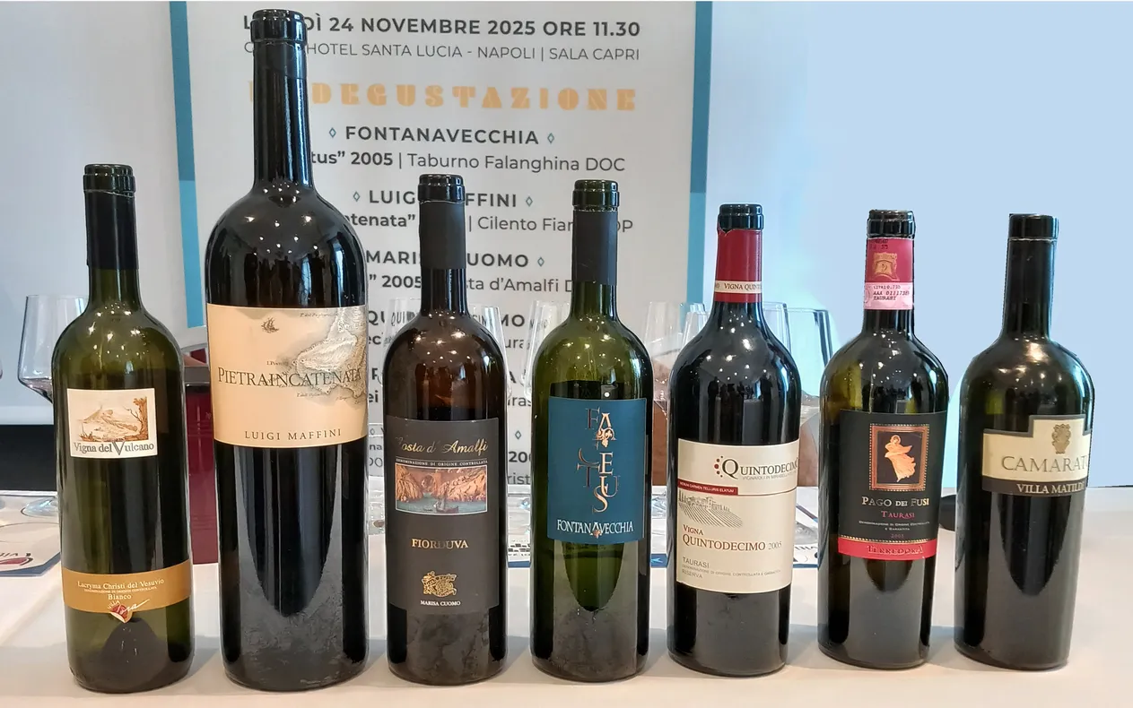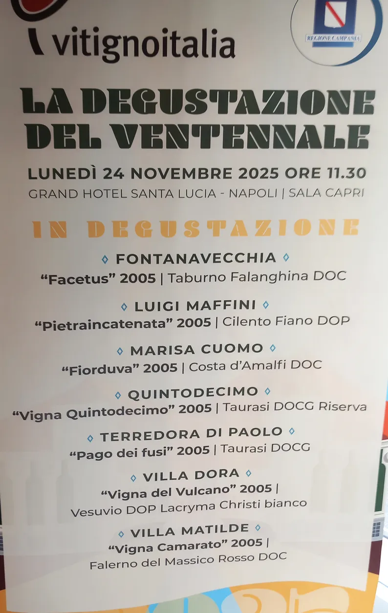 Anlässlich des 20-jährigen Jubiläums der italienischen Weinmesse VitignoItalia, gegründet 2005 und beheimatet in Neapel in Kampanien, wurde ich zu einer horizontalen Vergleichsprobe von Weinen aus dem Gründungsjahr 2005 alle aus Kampanien eingeladen, die am 24.11.2025 im Grand Hotel Santa Lucia in Neapel stattfand. Die Probe diente zugleich dem Zweck, das großartige Potential der Weine Kampaniens unter Beweis zu stellen. Vorneweg mein Gesamteindruck: Die Weine waren hervorragend, noch voll auf der Höhe und stellten das Potenzial der Region echt unter Beweis. So gibt es in Kampanien durchaus viel zu entdecken.Kampanien oder italienisch Campagna